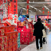 随着新年钟声的临近,不少商超开启了年货模式。小灯笼、红条幅、富贵花,12月26日,盒马鲜生二七万达店,迎面铺满浓浓喜庆氛围。“这一装扮,瞬间感觉年味儿来了,还上新了这么多年货礼盒。”李女士边翻看礼盒边感叹道。水果礼盒、坚果礼盒、糕点礼盒、精酿啤酒礼盒……引得不少消费者驻足挑选,部分礼盒上面标注了限时特价,拿某款坚果礼盒来说,原价249元,现在199元即可购买。