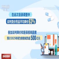 在此次目录调整中,谈判竞价药品平均降价63%。叠加谈判降价和医保报销因素,预计2025年将为患者减负超500亿元。