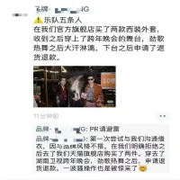 1月7日,有网友发帖称,五条人乐队在他的品牌旗舰店网购了两款西装外套,收到后穿上了某卫视跨年晚会的舞台,劲歌热舞之后大汗淋漓,下台之后申请了退货退款。