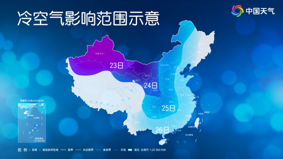这次寒潮影响范围广,将影响我国大部地区,降温直达云南、海南。23日,寒潮将主要影响新疆地区,24日影响西北地区,25日至26日影响中东部大部,27日继续影响东北地区、江淮东部、江南、华南等地。