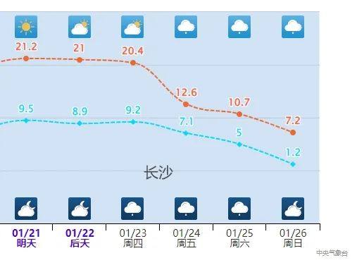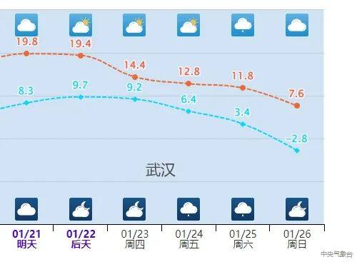 大城市中,银川今天最高气温7℃,随后气温缓慢走低,26日最高气温只有-8°C,累计降温幅度达到15°C;北京今天最高气温9°C,26日只有-2°C,将创今冬以来新低,也将是最高气温首次破零;武汉、长沙明后天最高气温20℃上下,26日就只有7至8℃,从春天重回冬天。