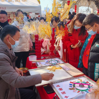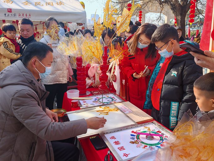 当非遗遇上文庙,一场关于传统文化的奇妙之旅即将开启。在郑州文庙前广场,蛋雕、面塑、吹糖人、核雕、葫芦烙画等二十项展示非遗传统技艺的摊位一字排开,热闹非凡。随着糖画手艺人干脆利落的弹转提拉,围观群众禁不住连连赞叹,年味十足。一个个非遗小帐篷伫立在文庙的红墙绿瓦之下,见证着中华优秀传统文化的薪火相传,照亮郑州市民内心的文化自信。