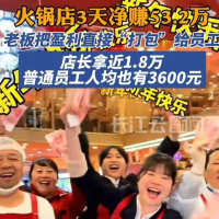 正月初三,在四川遂宁七里川火锅店,老板把除夕到初二这3天净赚的53.2万全发给员工,引起广泛关注。早在2024年春节,就有媒体报道,该店老板将大年三十和初一所有门店的营收全部36.5万元,分给了200多名员工。据报道,四年下来,该老板已经发出了150万元。