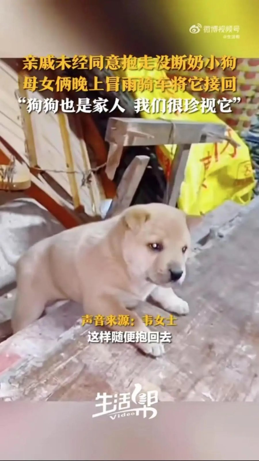 据报道,近日,广西南宁一对母女经历了一件小事:亲戚未经同意抱走了她家没断奶的小狗,母女俩晚上冒雨骑车将它接回。狗主人表示,小狗刚出生不久,担心别人照顾不好。“狗狗也是家人,我们很珍视它。希望你也有勇气去争取自己珍视的东西”。