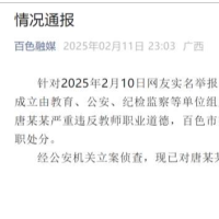 2月11日晚,广西百色深夜通报:涉嫌性侵学生的中学教师唐某某,被依法开除党籍、开除公职,并被公安机关立案侦查,现已被采取刑事强制措施。
