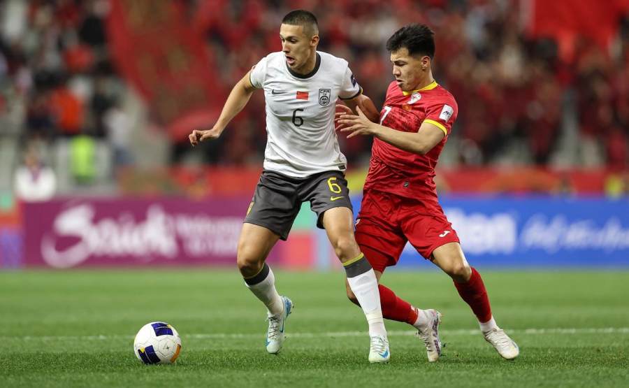 中国队首战2∶1击败卡塔尔队,而吉尔吉斯斯坦队则以1∶5不敌澳大利亚队。中国队开场就展开积极攻势,并利用对手防线靠前的特点频频送出身后球。第12分钟,中国队中场蒯纪闻在中场策动进攻,王钰栋接到长传后突入禁区横传,助攻首场比赛就有进球的攻刘诚宇破门。第24分钟,吉尔吉斯斯坦队扳平比分,10号球员马达米诺夫在禁区前沿晃开中国队防守队员,左脚劲射破网。尽管重回平局,中国队仍是占据主动的一方,控球率、射门数和角球均高于对手。半场结束前,刘诚宇突入禁区后被对方绊倒,为球队赢得一个点球。王钰栋一蹴而就,将比分改写为2∶1。中国队以领先优势进入中场休息。