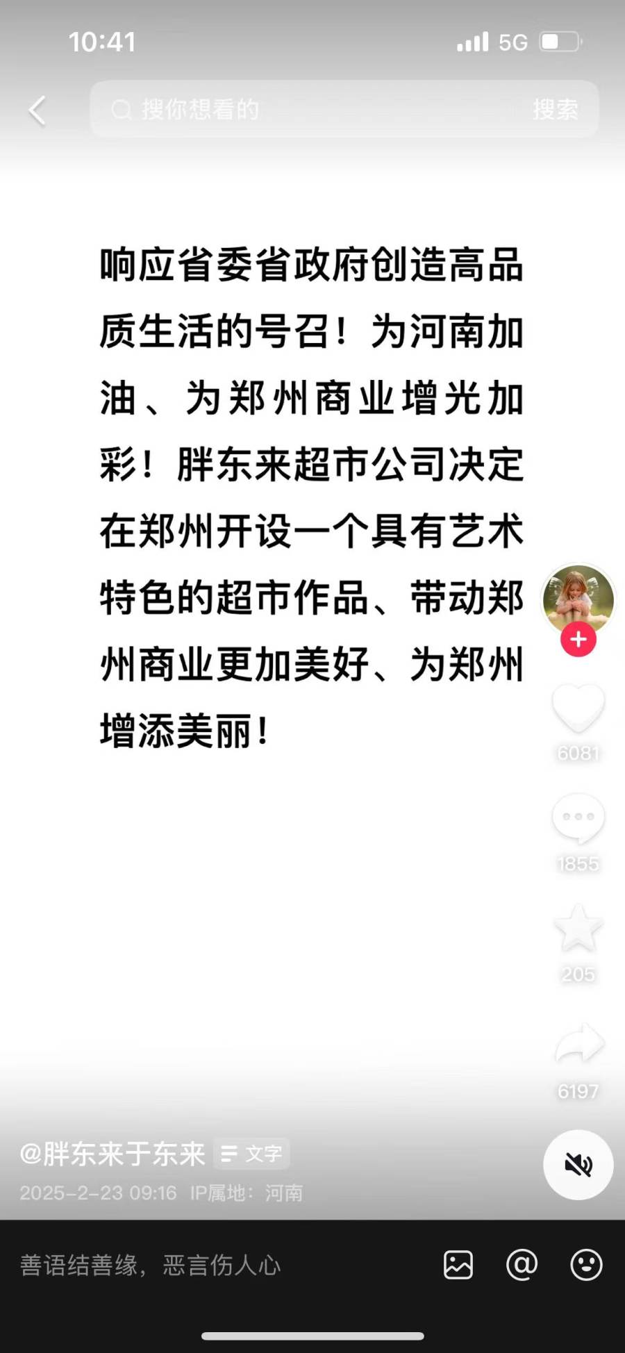 2月23日,胖东来创始人于东来在社交媒体发文称,为响应省委省政府创造高品质生活的号召,为河南加油、为郑州商业增光加,胖东来超市公司决定在郑州开设一个具有艺术特色的超市作品,带动郑州商业更加美好,为郑州增添美丽!