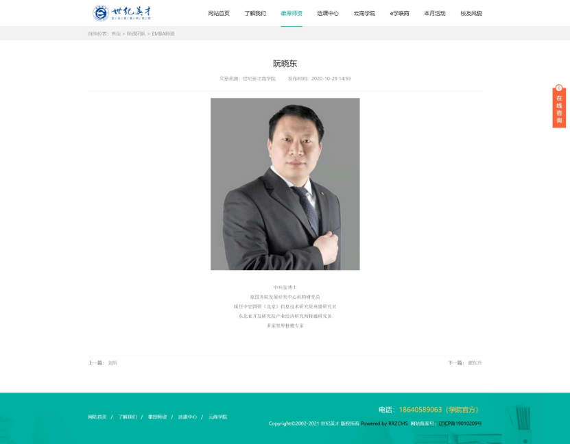 在世纪英才商学院官网上,阮晓东身份被注明为“现任中宏国研(北京)信息技术研究院高级研究员” 图片来源:世纪英才商学院官网