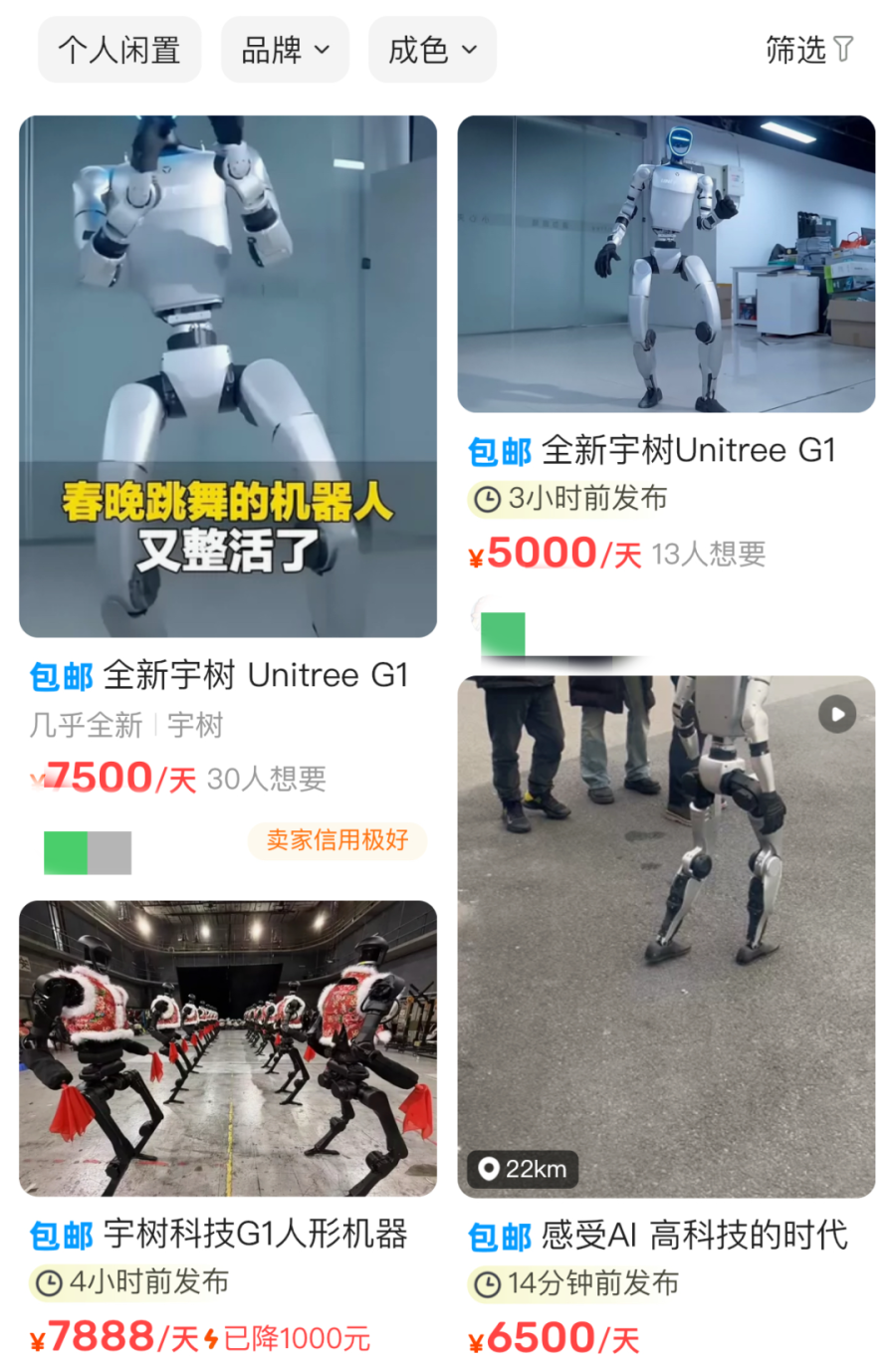 一个月后,这股热潮从荧幕蔓延至现实,自H1和G1人形机器人发售以来,商家嗅到了商机:开始提供租赁服务, 以“春晚同款”为标签出租的机器人,日租金有的已经接近万元。