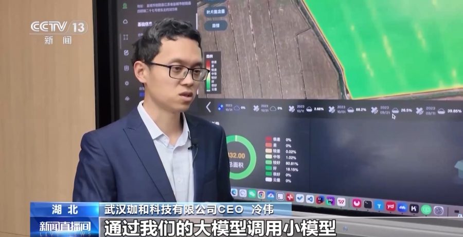 武汉珈和科技有限公司CEO 冷伟:我们接入DeepSeek的一个对话平台,是可以直接问它种植情况怎么样,它就有点像一个农业小助手,它可以给你一个好的建议或者是一些方案。另外,我们可以通过这样的数据快速获取到这个区域的灾损情况,通过大模型调用小模型,快速能够得到终极的分析报告或分析内容。