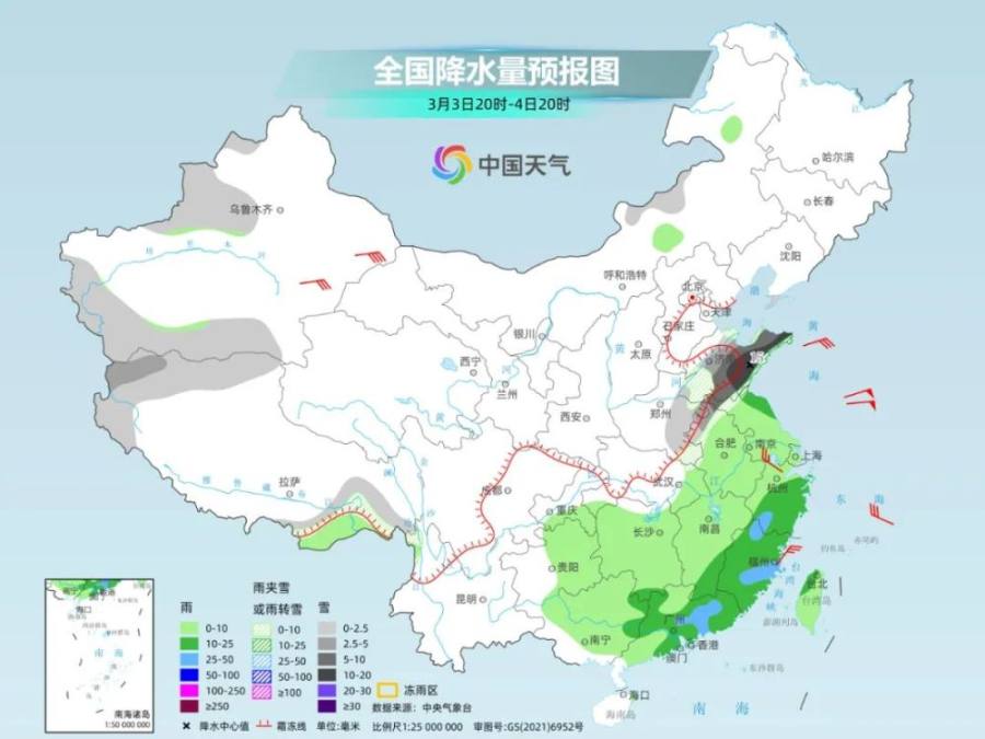 3日,随着冷空气南下,雪线将继续向南推进,山西、山东、河南、湖北会有更多地方转为纯雪,其中山东东部和南部、河南东部和南部、安徽北部、江苏北部、湖北北部等地部分地区有大雪或暴雪。与此同时,江南、华南等地降雨将再度增多,浙江、江西、湖南南部、广东、福建等地或有中到大雨、局地暴雨。