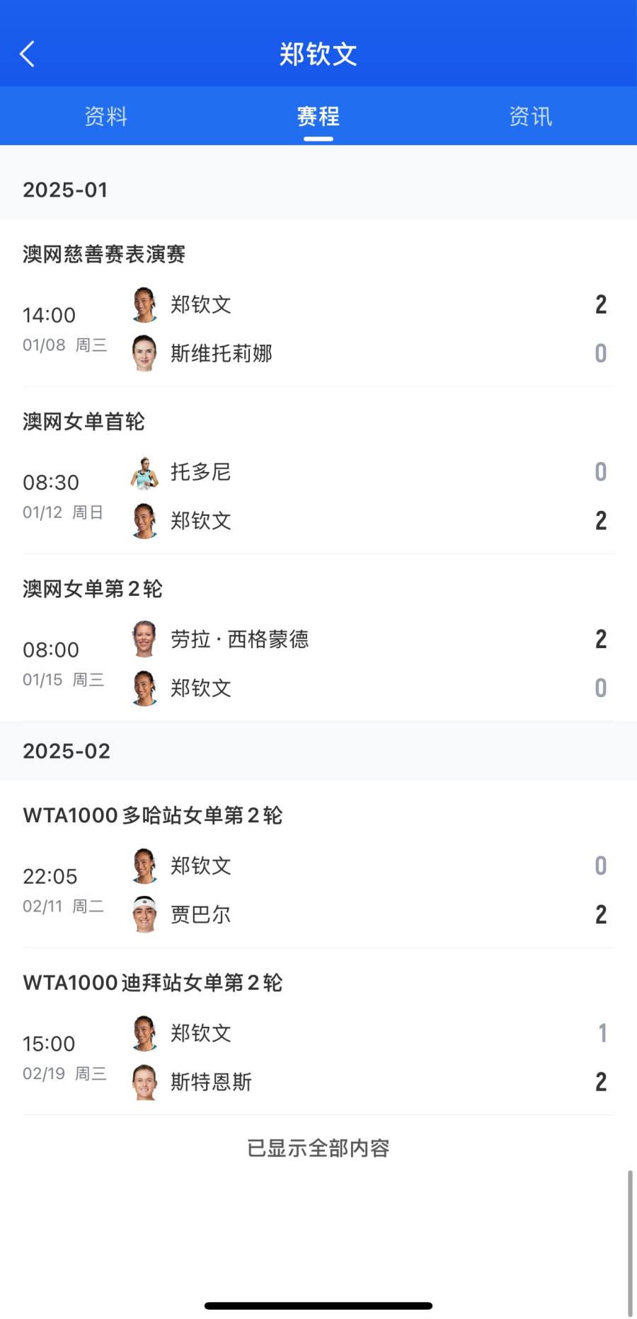 2025赛季,郑钦文在澳网、WTA1000多哈站和WTA1000迪拜站均止步次轮。