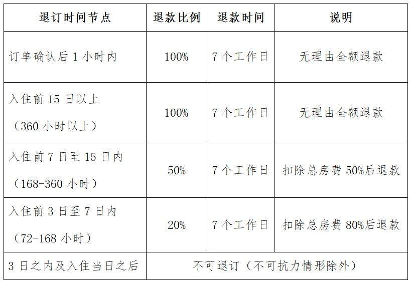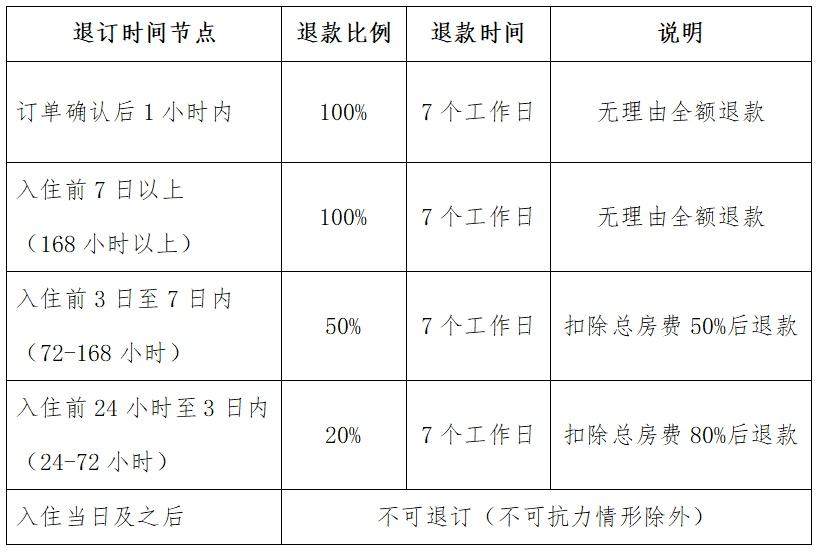(一)不可抗力:因自然灾害、公共卫生事件、航班取消等不可归责于消费者的客观原因退订,住宿业经营者、线上预定平台在消费者提供相应佐证材料后须全额退款。