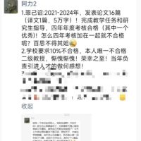 疑为“李力”另一ID的“阿力2”在朋友圈发“罪己诏”感叹:“我自认无能。2021-2024年,发表论文16篇(译文1篇,5万字)!完成教学任务和研究生指导,四年考核都合格,还有一年优秀,怎么合到一起就不合格了呢?学校要求10%不合格,本人唯一不合格二级教授,惭愧惭愧!荣幸之至!当年负责引进人才的做何感想!”