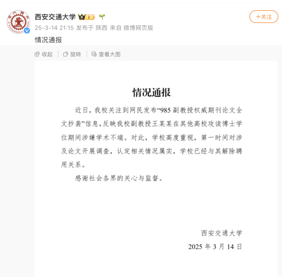 西安交大通报“副教授论文全文抄袭”:属实,解聘