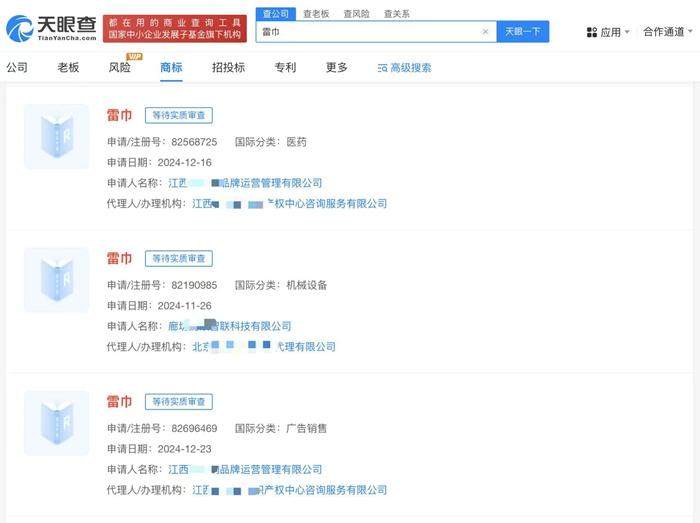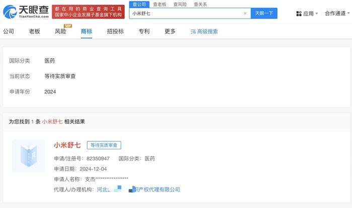 记者注意到,天眼查显示,小米科技有限责任公司此前已取得的“小米”商标中,包含消毒湿巾、卫生护垫等商品服务,显示2023年6月14日“已注册”。不过“雷巾”“小米舒七”等被多方申请注册为商标,这些商标状态多为等待实质审查。