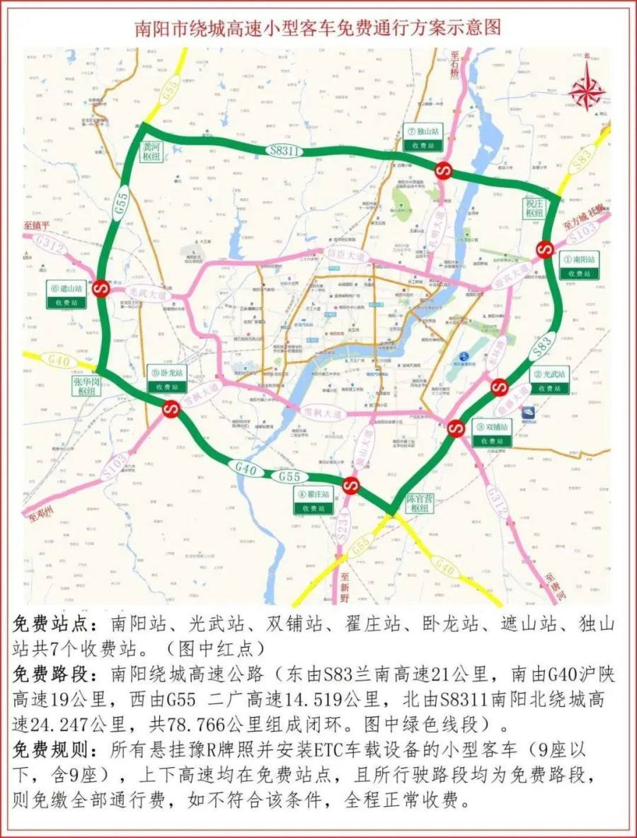 免费站点:南阳站、光武站、双铺站、翟庄站、卧龙站、遮山站、独山站共7个收费站。