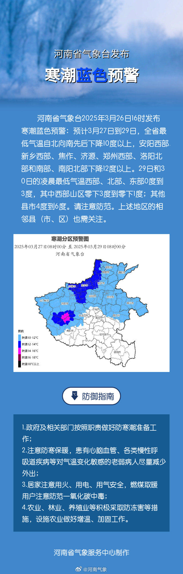 河南省气象台2025年3月26日16时发布寒潮蓝色预警:预计3月27日到29日,全省最低气温自北向南先后下降10度以上,安阳西部、新乡西部、焦作、济源、郑州西部、洛阳北部和南部、南阳北部下降12度以上。29日和30日的凌晨最低气温西部、北部、东部0度到3度,其中西部山区零下3度到零下1度;其他县市4度到6度。请注意防范。上述地区的相邻县(市、区)也需关注。