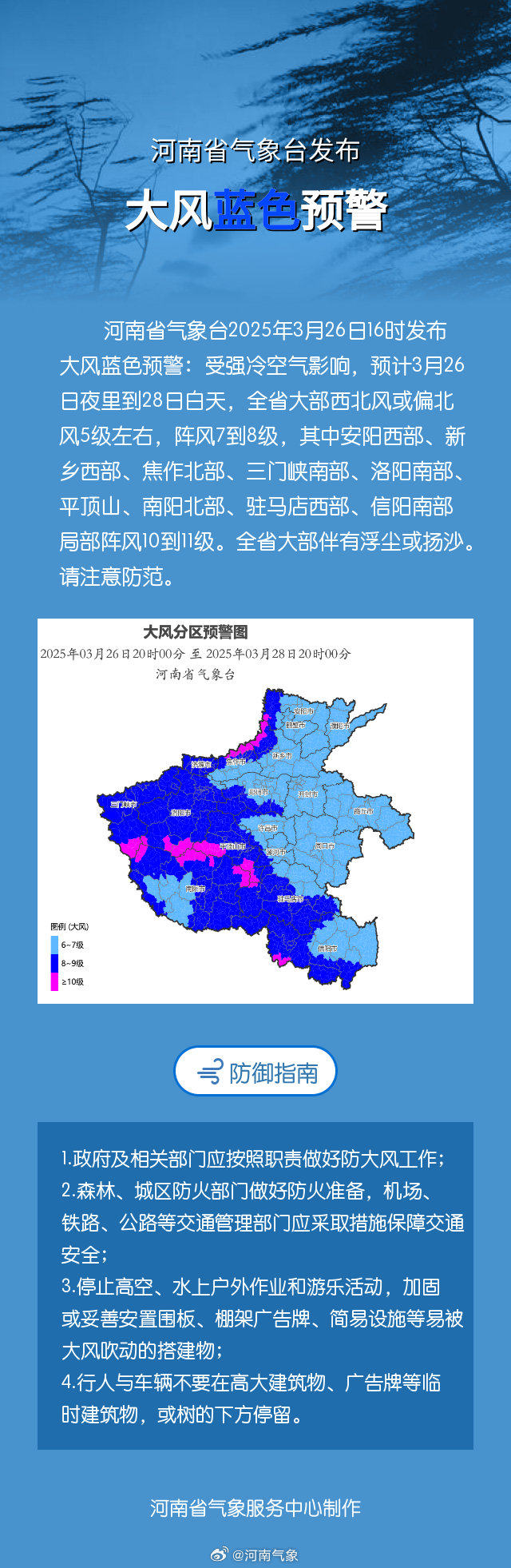 河南省气象台2025年3月26日16时发布大风蓝色预警:受强冷空气影响,预计3月26日夜里到28日白天,全省大部西北风或偏北风5级左右,阵风7到8级,其中安阳西部、新乡西部、焦作北部、三门峡南部、洛阳南部、平顶山、南阳北部、驻马店西部、信阳南部局部阵风10到11级。全省大部伴有浮尘或扬沙。请注意防范。