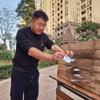 李县泉,老家在商丘禹城,幼年在武校习练童子功,步入社会仍对传统武术和武侠故事充满热爱。2019年,为摆脱对手机的依赖,他在功夫群里与朋友交流,决定一起练习飞牌。