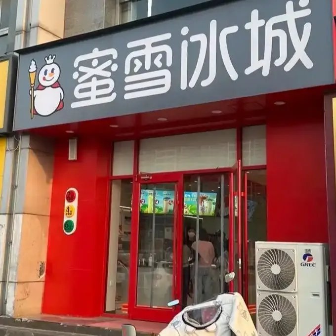 网友晒出的一张“黑灰色”底的蜜雪冰城门头牌匾