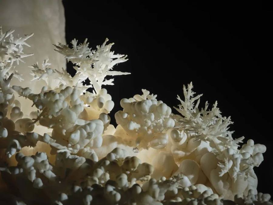 探险队员在洞内发现的“石葡萄”上长“石花”景观。