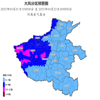河南省气象台2025年4月21日10时发布大风蓝色预警:受冷空气影响,预计4月21日10时至22日20时,我省大部有4到5级西北风或偏北风,阵风6到7级,其中安阳西部、新乡西部、焦作北部、济源、三门峡、洛阳、郑州西部、平顶山中西部、许昌西部、南阳北部部分县(市、区)阵风8到9级,局部可达10到11级。全省大部伴有扬沙或浮尘。请注意防范。上述地区的相邻县(市、区)也需关注。
