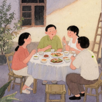 一家人围坐在饭桌旁,这个人拿棵葱,那个人拿棵菠菜,另一个人则可能把香菜卷上一绺,大家纷纷把这些碧绿的蔬菜伸向酱碗,吃得激情飞扬的。而此时蚊烟静静地在半空浮悬,晚霞静悄悄地落着,天色越来越黯淡,大家的脸上就会呈现出那种知足的平和表情。