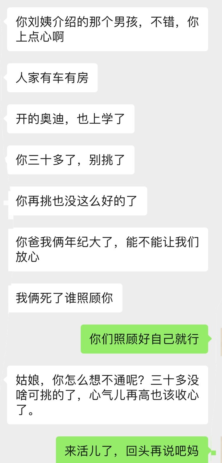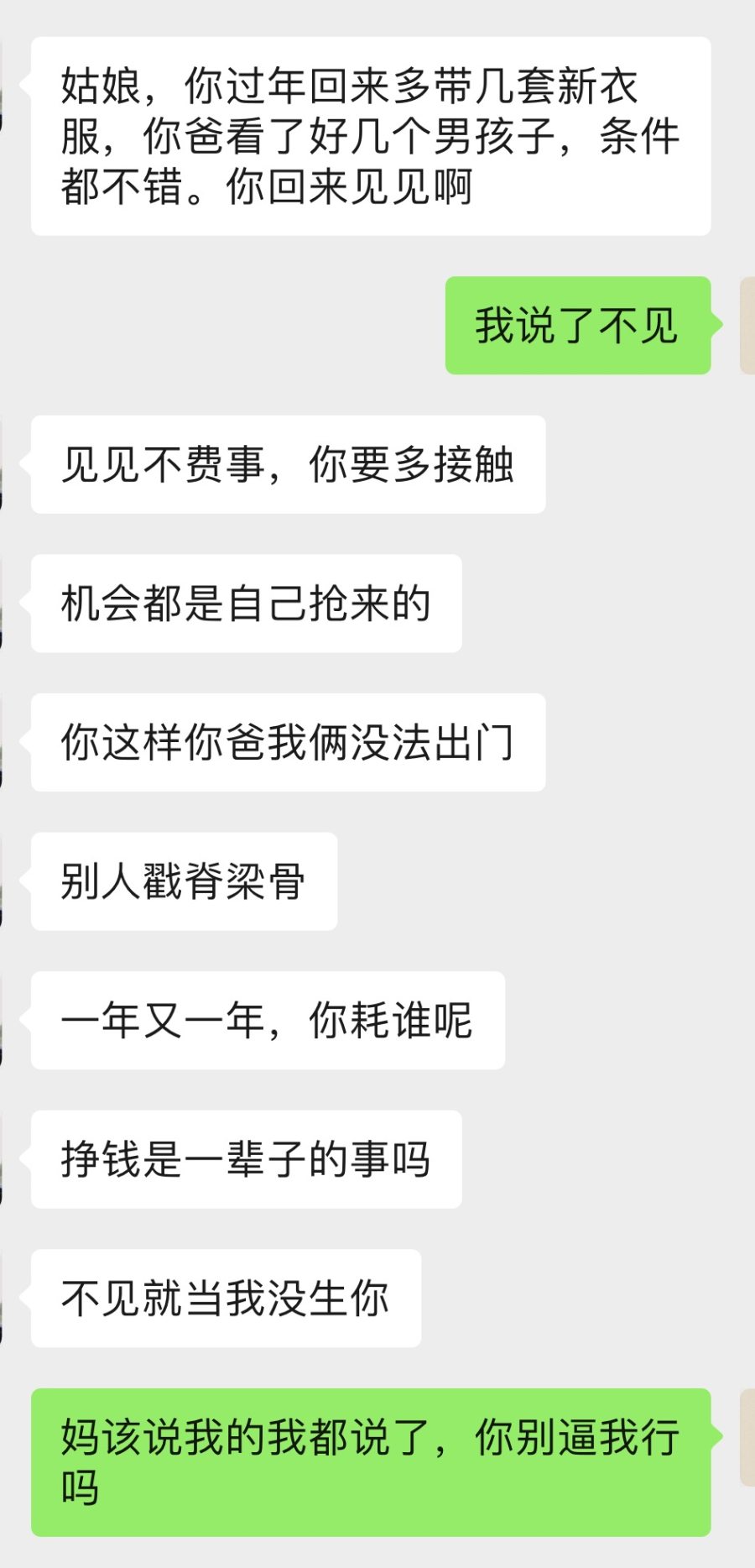 “你刘阿姨的女儿20岁就嫁人了,现在都生娃了。你能照照镜子看看自己什么德行吗?有什么资格挑三拣四的?”“我把你的资料发到相亲群里,都没有男的愿意跟你见面。”“你知道现在是什么形势吗?你30岁了!什么感情不感情,有男人要你就烧高香了。”这些对话在过年期间随时随地开启,大多数情况下都是妈妈声情并茂的单口相声,炒菜的时候拿着铲子戳到脸上,早上赖床的时候直接掀开被子站在床头,连搓麻将的时候都能配合着出牌时的摔打口水四溅。