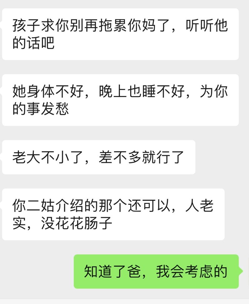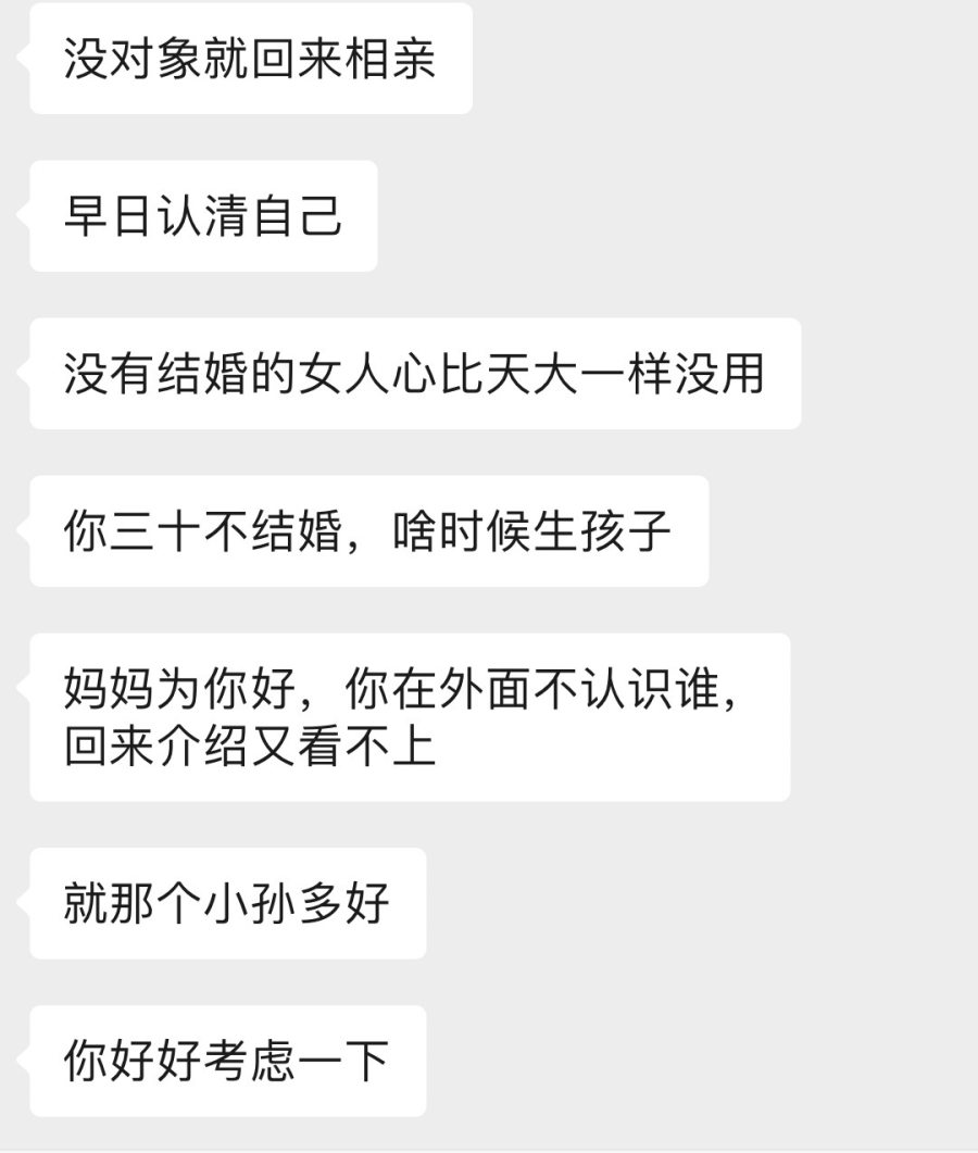 第二天收拾行李离开老家后,胡卿就把母亲的微信设置成了免打扰。接连不断的语音消息撕扯着她的心情,有一段时间她甚至觉得自己抑郁了。胡卿在“家族帮卿找对象”的群里发过一句话“求求你们放过我吧”,消息很快被大批的表情包淹没,被大家当作一句玩笑刷过去了。