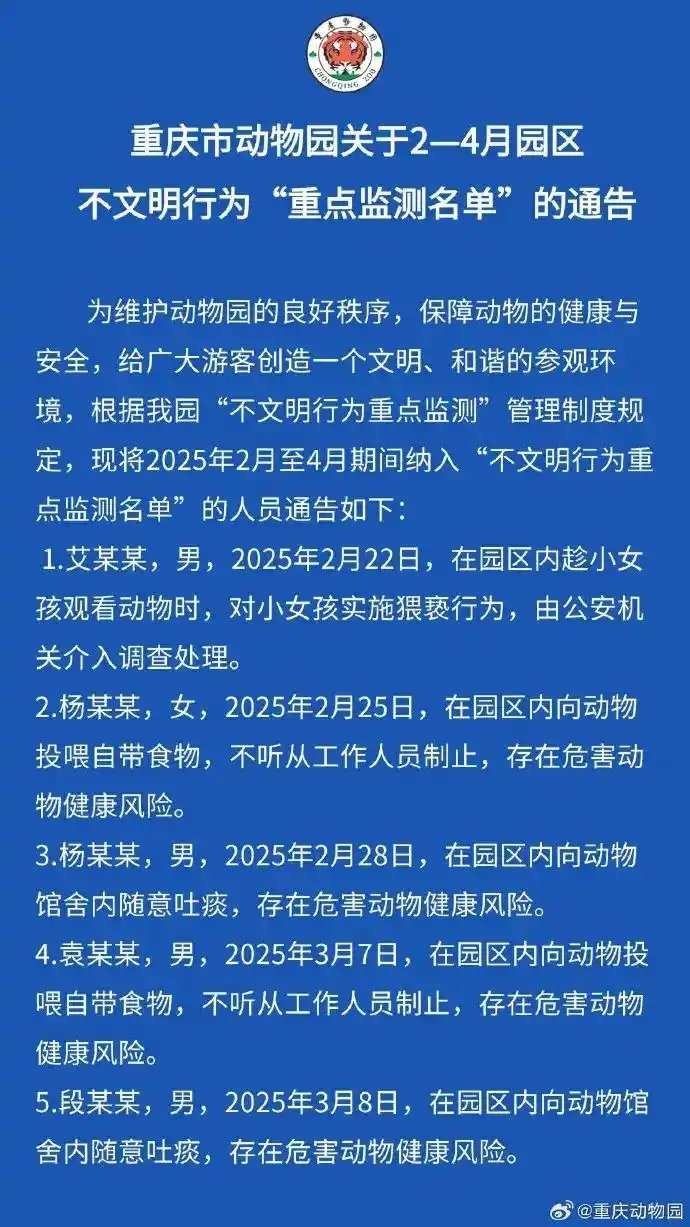 近日,重庆市动物园发布通告称,对36名人员纳入“不文明行为重点监测名单”,在其不良记录消除前,禁止入园。