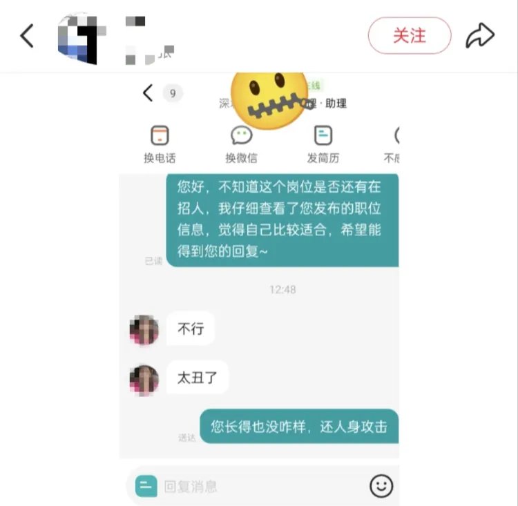 最近,有网友发帖表示,自己在Boss直聘上看到深圳某财务管理公司在招聘文员,于是联系了对方,结果对方直接回复“不行,太丑了”。此前,还有招聘人员称求职者是“下等人”。这些事件看似偶然,却暴露出有的企业对求职者缺乏基本尊重。