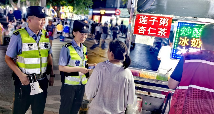 18时以后,健康路夜市的摊贩们纷纷出摊,人流也开始增大。回到所里随便吃了两口饭后,曾夏南便带着辅警再次来到健康路上,开始例行巡逻防控。熙攘的人流中,不时有商贩给民警打招呼,也有卖饮品的商贩给民警送水。“谢谢你,我刚在所里喝过水。对了,前几天给你说的陌生电话不能随便接,后来你又接了没啊?”曾夏南和饮品店老板聊着,还不忘提醒他要防范电信诈骗。