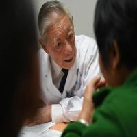 百岁高龄的张效房在门诊为病患检查一丝不苟。摄影 周甬