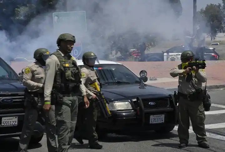 美国移民与海关执法局(ICE)等联邦机构执法人员6日搜捕非法移民,突袭洛杉矶市至少7处地点,包括购物中心和工厂,逮捕44人。行动中,执法人员遭到当地社区居民围堵,不断发生肢体冲突。当晚,大约500名抗议者聚集在洛杉矶市中心,举着“ICE滚出洛杉矶”等标语,试图冲击一处拘留所,与前来维持秩序的洛杉矶当地警察发生冲突。警方使用警棍、催泪弹和橡皮子弹驱散抗议者,抗议者用砖头和石块还击。