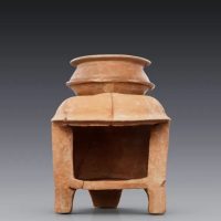 红陶釜灶,新石器时代仰韶文化陶炊具,红胎,夹砂陶制。它由陶釜和陶灶巧妙组合而成,结构简单实用。