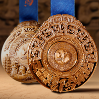 今年“郑马”的奖牌整体造型为圆形设计,象征着圆融、圆满,承载着和谐、通达的精神内涵。马拉松和半程马拉松项目的奖牌依然走的是青铜“重器”风。奖牌的正面采用两层式设计,上半部分(也就是外层)是“郑马”奖牌常用的青铜器饕餮纹造型,下半部分(里层)是凸凹有致的姓氏矩阵,传递着中原厚重的姓氏文化。奖牌背面,炎黄二帝像、二七塔、大玉米、杜岭方鼎、莲鹤方壶的浮雕造型,展示着郑州既古老又现代的独特魅力。