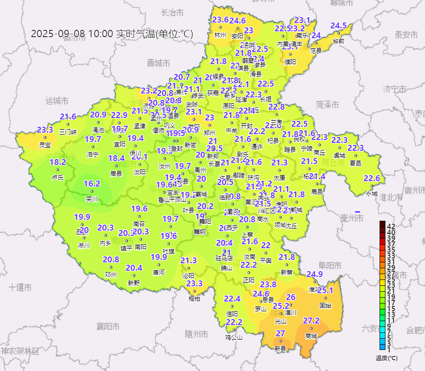 新的一周,河南依然在阴雨天气中开启。今天上午,天空云层较厚,大部分地区有降雨云系发展,黄淮之间多地出现小到中雨,其中东部和南部部分地区雨势较为明显。上午10时,除东南部地区气温25-27℃以外,其他地区气温普遍在20℃左右,凉意逐渐加重,体感舒适。