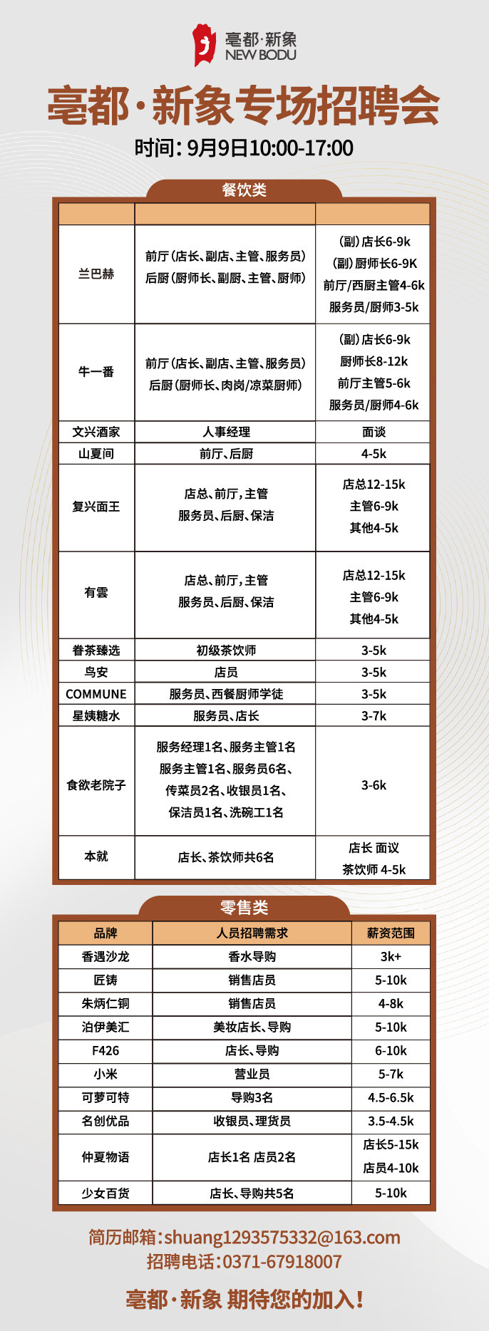 本次招聘会于9月9日10:00-17:00举行,地铁2号线东大街站、3号线文庙站均可直达。求职者可携带简历至现场投递并直接参与面试,也可通过邮箱提交简历。主办方还提供了咨询电话0371-67918007,方便求职者了解更多信息。(邮箱地址:shuang1293575332@163.com)