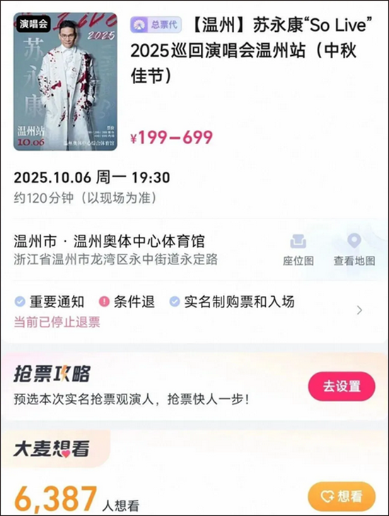 近日,涉毒艺人苏永康拟于10月初在温州举行演唱会被网友投诉举报。9月16日,大麦网已经下架其相关演出,演出主办方已向审批单位提交演出取消的申请。