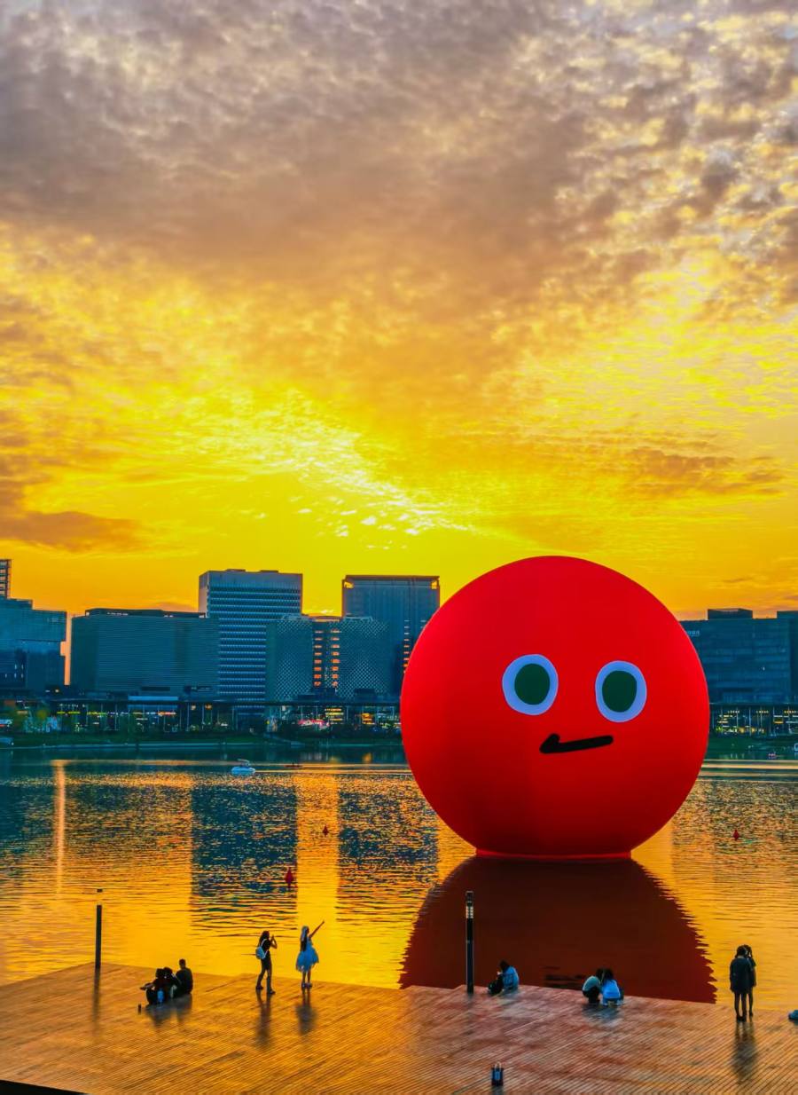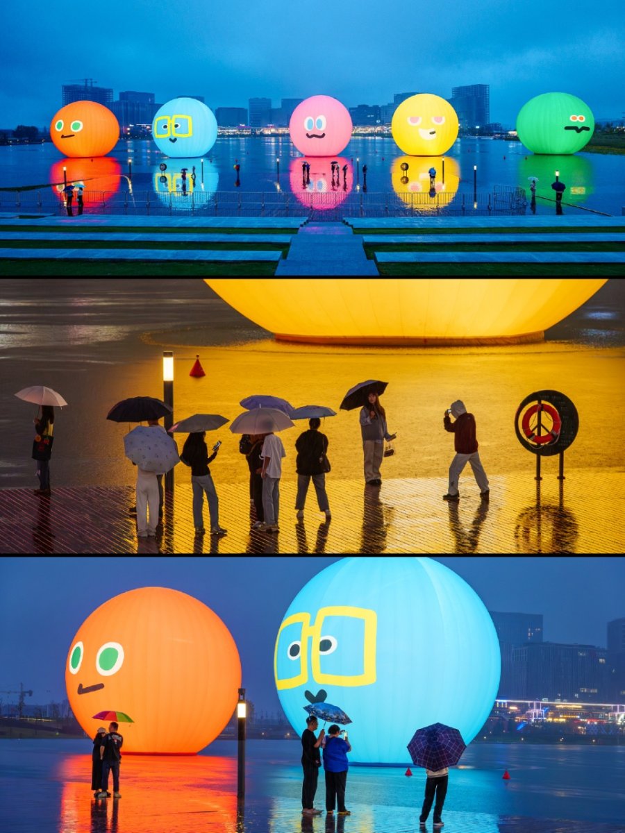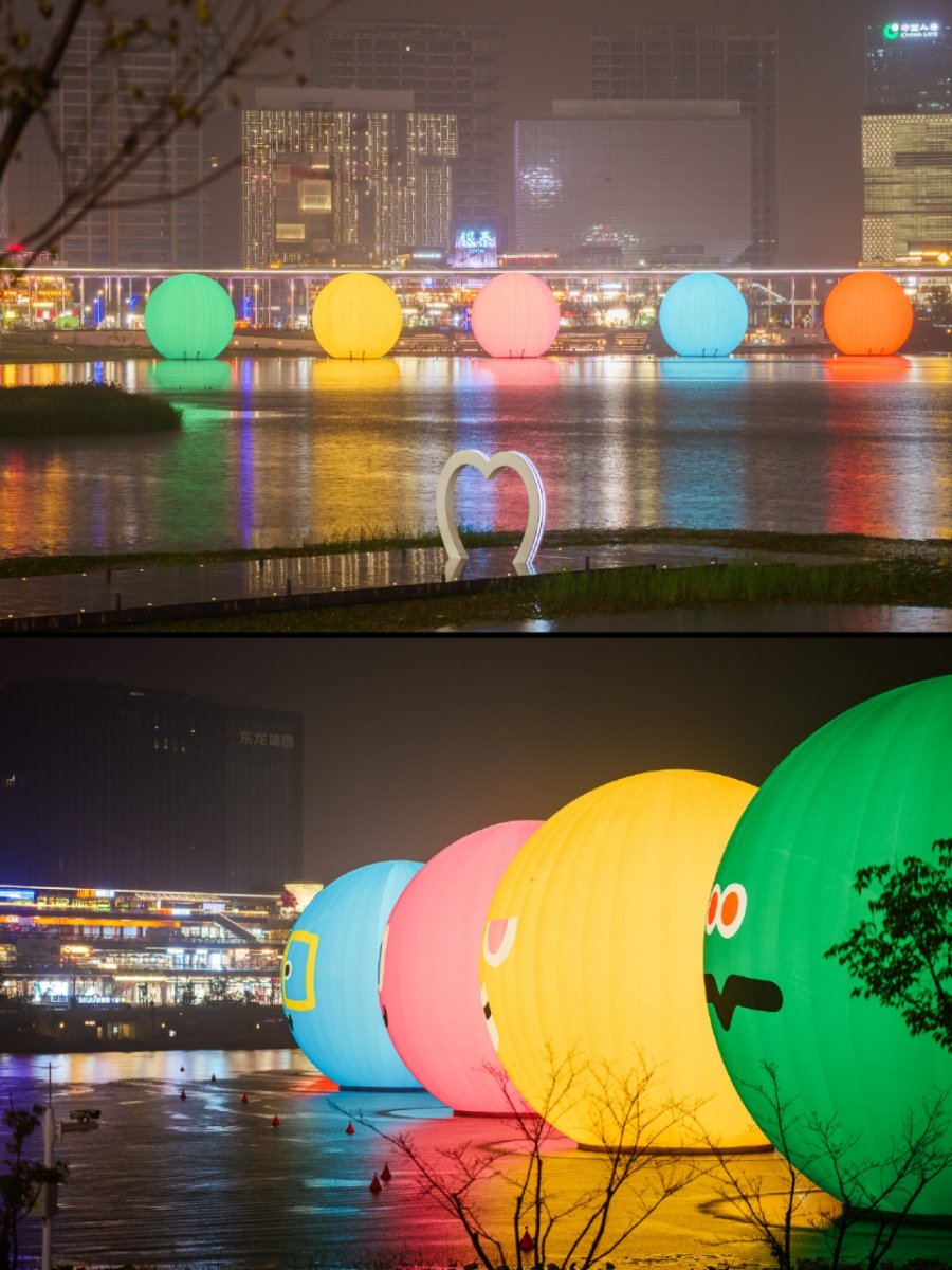 与此同时,五月天乐团25周年巡回演唱会的标志性艺术装置——“五球”,也首次亮相龙湖金融岛。由蓝、红、黄、绿、橙五色巨型球体组成的“五球”,象征着成年世界中依然保有的童心与幽默。此次落地,不仅为即将到来的五月天郑州演唱会预热,更成为岛上又一吸睛亮点。夜幕降临,“五球”灯光点亮,倒映湖中,与晚霞交相辉映,吸引全国歌迷前来拍照留念。在湖边迎着落日,与“五球”同框,成为这个假期里一份难得的惬意与浪漫。