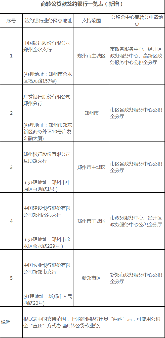10月30日,郑州住房公积金管理中心发布通知,新增中国银行股份有限公司郑州金水支行等5家商业银行成为“商转公贷款”签约银行,截止目前,郑州已有60家银行支持商转公贷款直还模式。