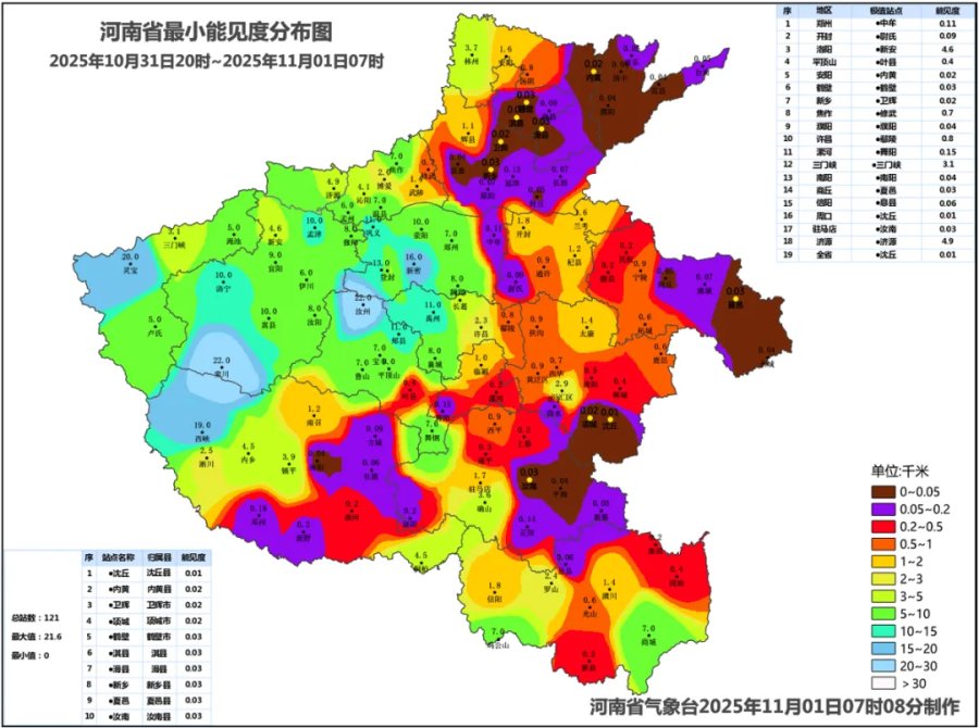 受冷空气影响,昨天(10月31日)河南中西部风力明显加大,部分地区阵风达8到9级。随着大风的到来,昨夜到今晨,中西部能见度明显转好,而在其他地区大雾依旧持续,其中沈丘站的最低能见度仅10米(特强浓雾)。