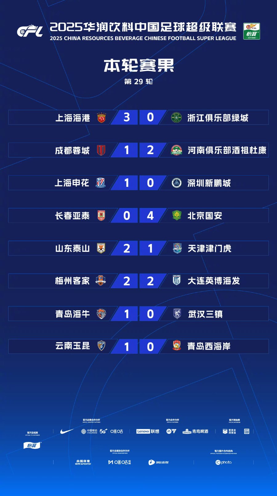 11月2日,历时3个比赛日的中超第29轮八场角逐全部结束。成都蓉城在主场遭遇了河南杜康的顽强阻击,从而退出了争冠行列,而长春亚泰在惨败于北京国安之后,成为了今年的第一支降级球队。联赛还剩余最后一轮,冠军的归属和另外一个降级名额仍不确定,2025赛季的中超,还是把悬念留到了最后。