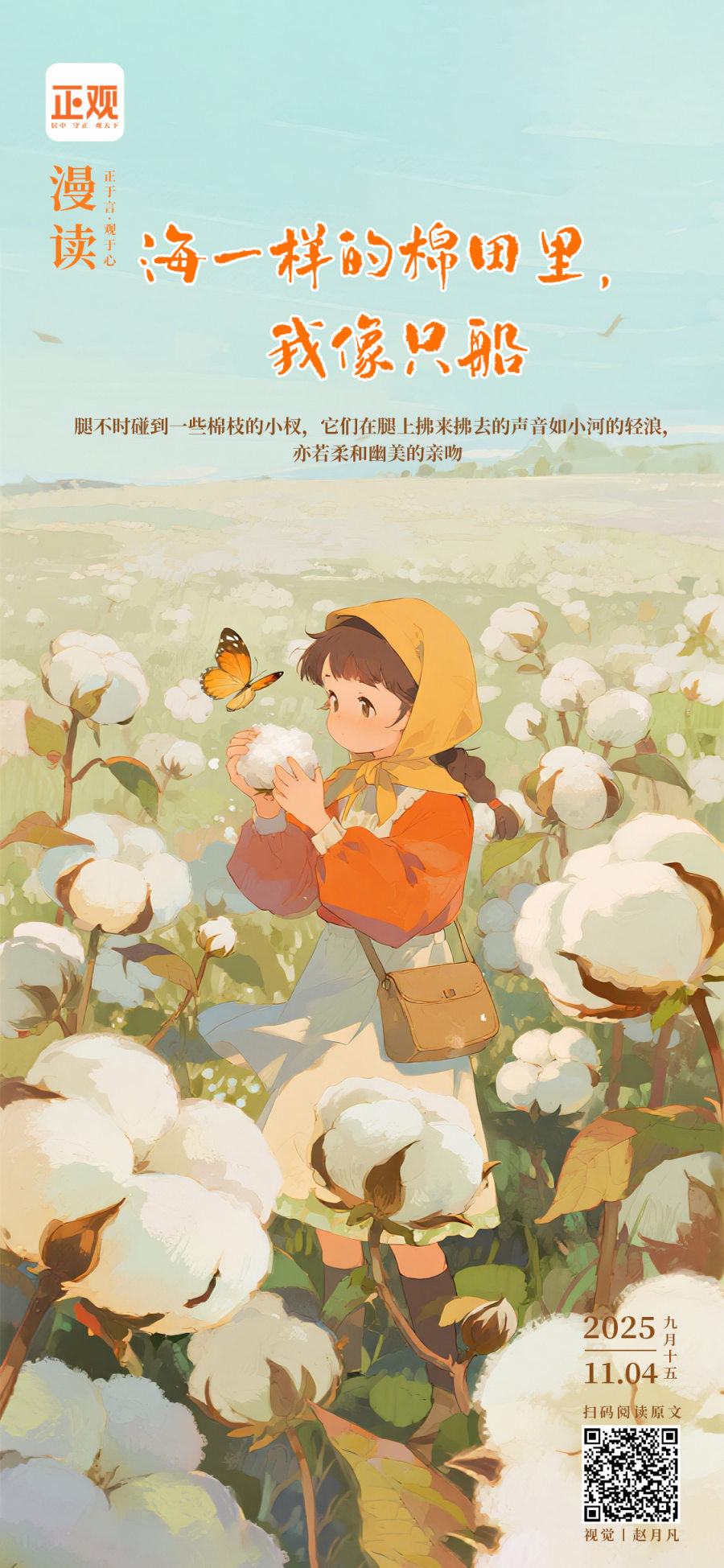海一样的棉田里,我觉得自己就像一只划行的船,两条腿就是桨。腿不时碰到一些棉枝的小杈,它们在腿上拂来拂去的声音如小河的轻浪,亦若柔和幽美的亲吻。