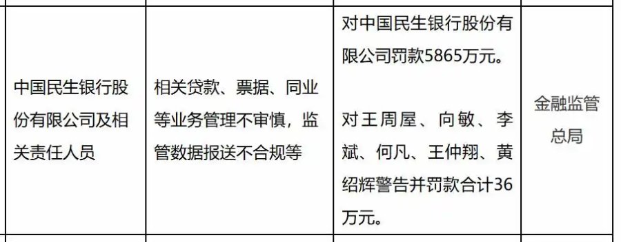 金融监管总局对中国民生银行股份有限公司罚款5865万元。对王周屋、向敏、李斌、何凡、王仲翔、黄绍辉警告并罚款合计36万元。