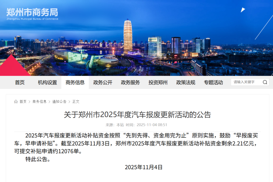 2025年汽车报废更新活动补贴资金按照“先到先得、资金用完为止”原则实施,鼓励“早报废买车,早申请补贴”。截至2025年11月3日,郑州市2025年度汽车报废更新活动补贴资金剩余2.21亿元,可提交补贴申请约12076单。