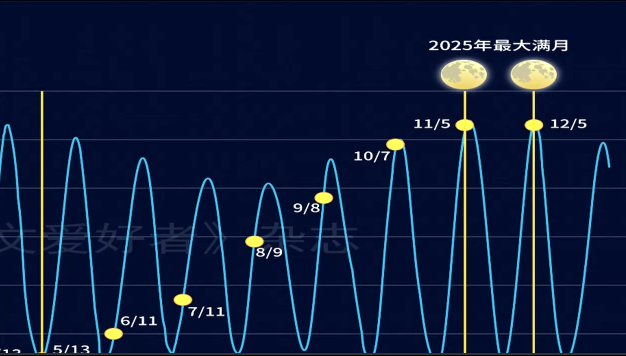 1月5日21时19分前后,月亮呈现出最完满的圆形,9个小时后,也就是11月6日6时27分,月球过近地点,距离地球约35.7万公里,这是2025年所有满月中与地球最近的一次。因此,11月5日晚上的这轮月亮将是今年的最大满月,俗称“超级月亮”。