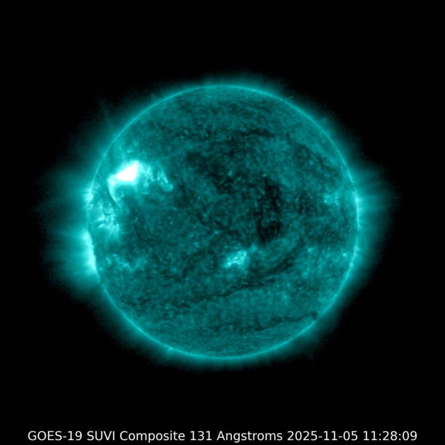 △图中圆盘区域为131埃波段下的太阳,左侧偏上的白色高亮区域就是太阳耀斑(图源:空间天气)
