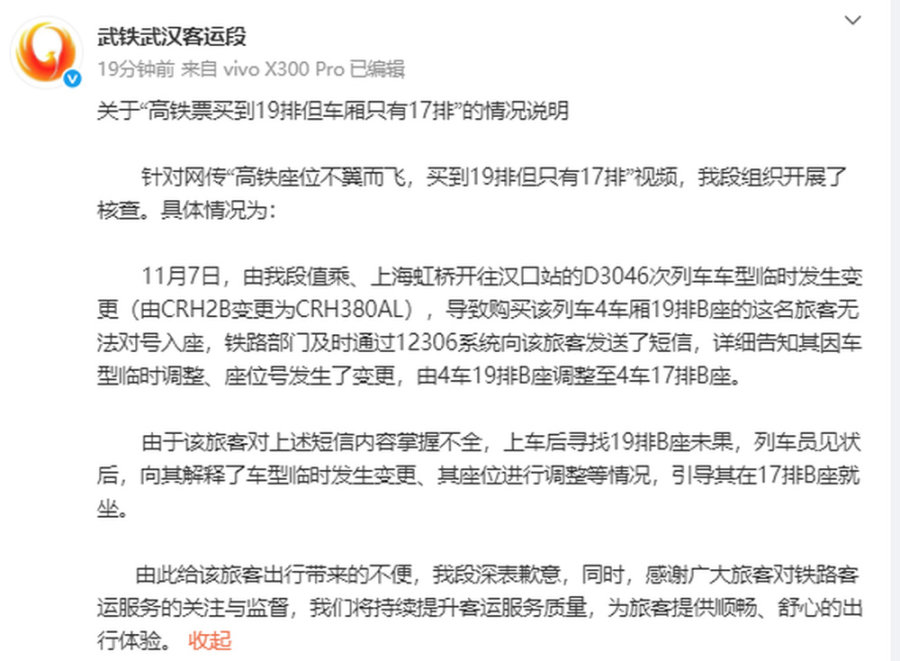 官方通报“高铁票买到19排但车厢只有17排”:临时变更列车车型,给该旅客出行带来的不便,深表歉意